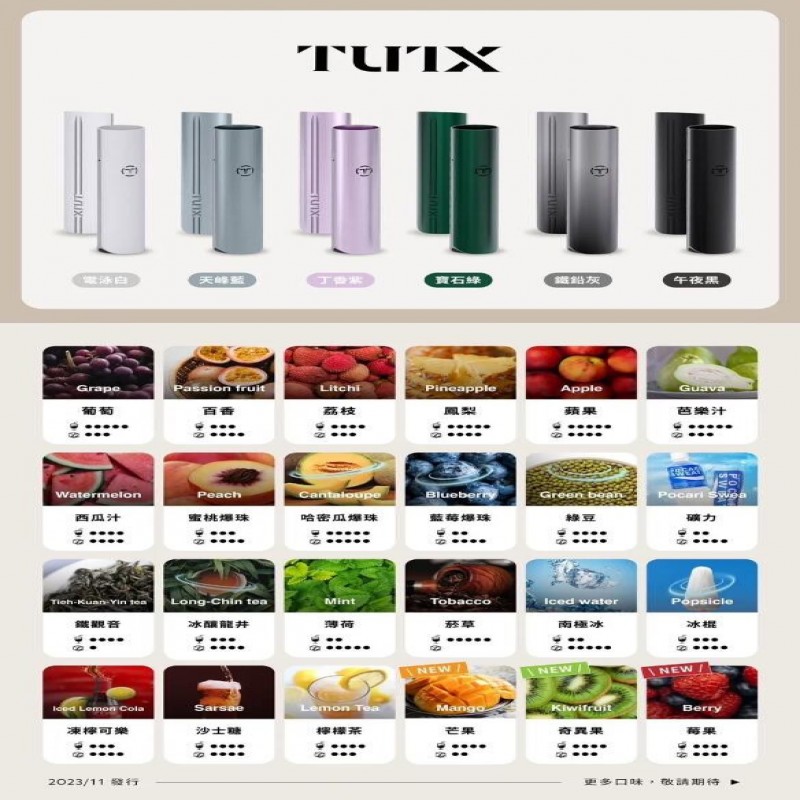葡萄 西瓜汁 百香 荔枝 鳳梨 蜜桃爆珠 鐵觀音 冰釀龍井 薄荷 菸草 冰棍 凍檸可樂 沙士鹽 檸檬茶 芒果 莓果 蔓越莓